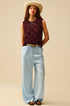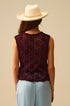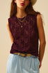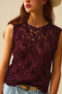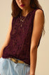 This top features a classic sleeveless design perfect for warmer weather. It's crafted in a rich burgundy purple hue adding a touch of elegance to any outfit. The crew neckline offers a flattering frame to the face while the standard cut ensures comfort and ease of movement. Crafted in a delicate crochet fabric it's semi-sheer for a touch of allure. The lettuce trim gives it a charming playful finish making it an ideal choice for casual or dressier occasions.