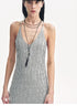 The loose, streamlined dress body is slightly cinched at the waist to create a waistline, setting off a slender figure. The front piece features thin shoulder straps and a V-neck, elongating the neck, making one look slimmer and the face smaller. The suspenders on the back are connected to metal rings, revealing the shoulder blades generously, exuding a sexy charm. It combines modern and retro styles, achieving the ultimate in fashion.
