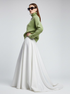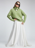 The design has a wide folded high collar (turtleneck), providing an elegant and sophisticated silhouette. It is masterfully paired with an immaculate white silk or satin maxi skirt with an A-line and fluid drape. The combination of textures (fuzzy knit and smooth satin) and colors (neutral green and crisp white) creates a high-luxury look, perfect for a daytime event or special occasion.