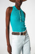 Subcategory: Top. Collar: Polo collar. Sleeves: Sleeveless style. Fit: Bodycon fit. Style: Daily. Detail: Button detail. Fabric: Ribbed knit. Zipper: Partial button placket. runs small. S.