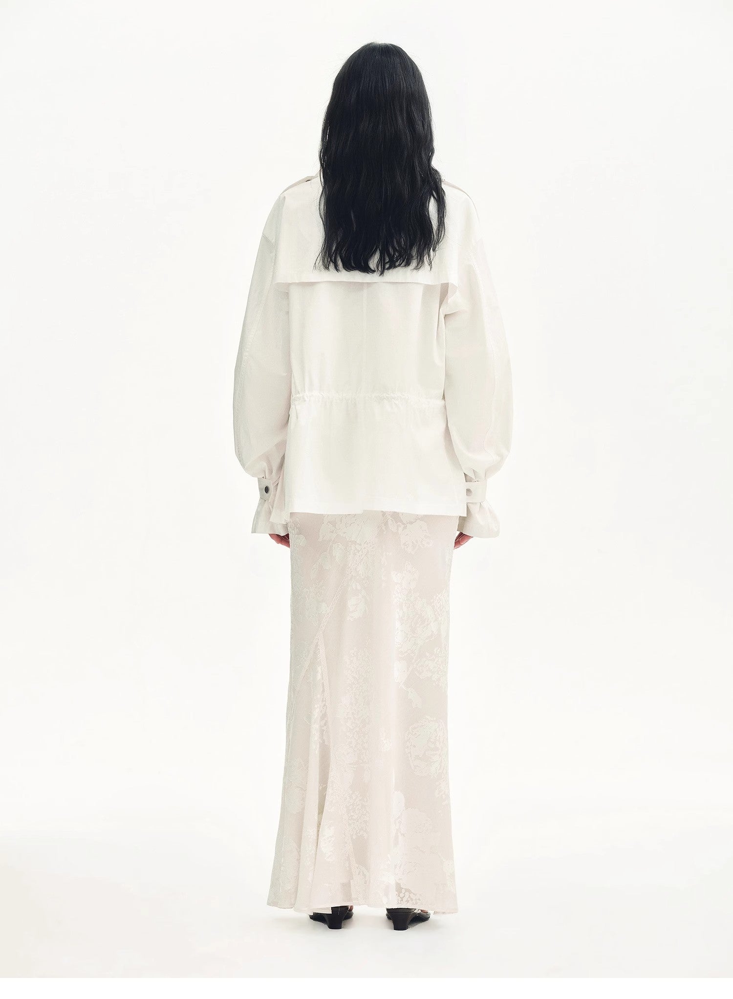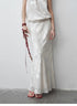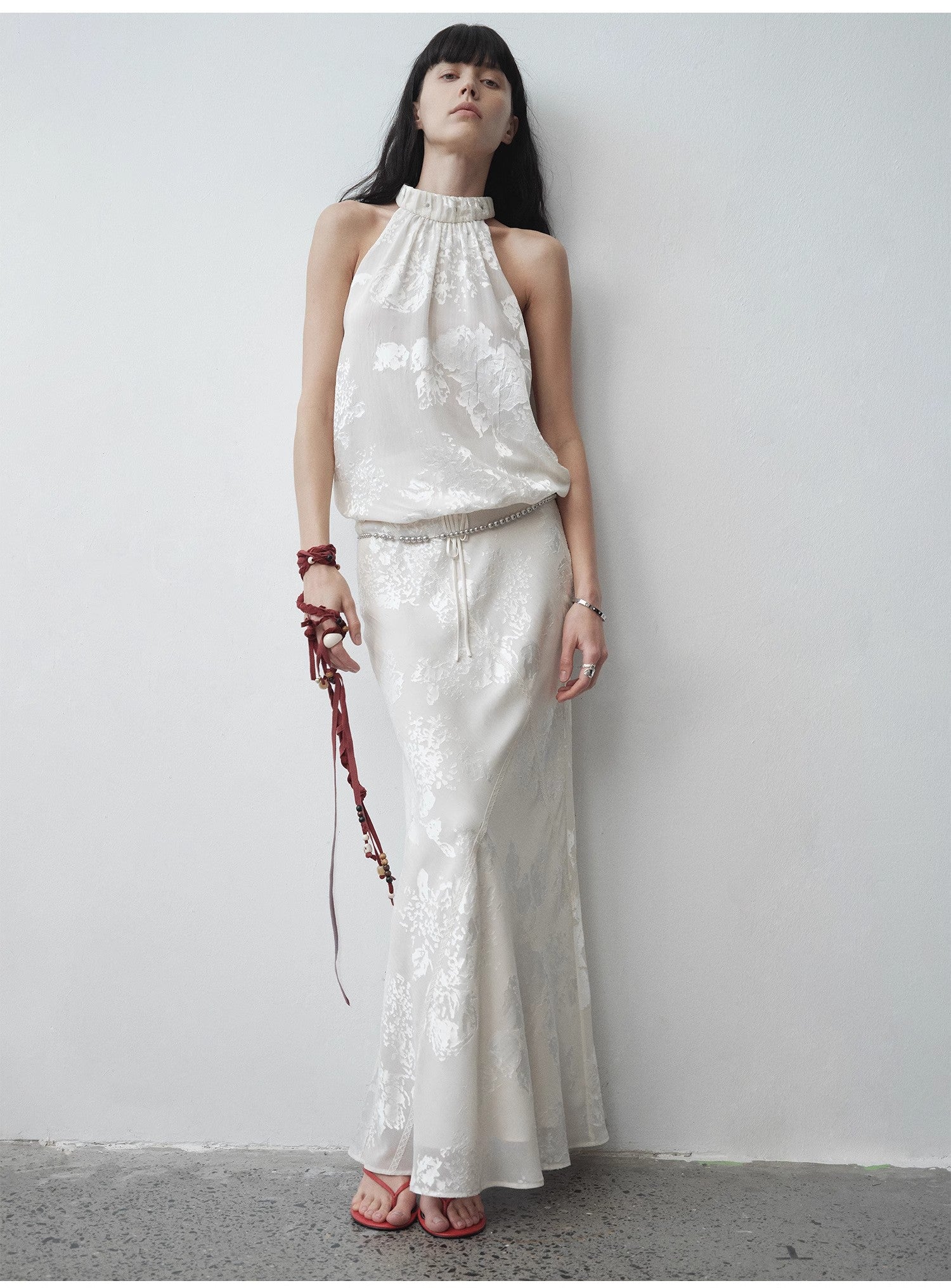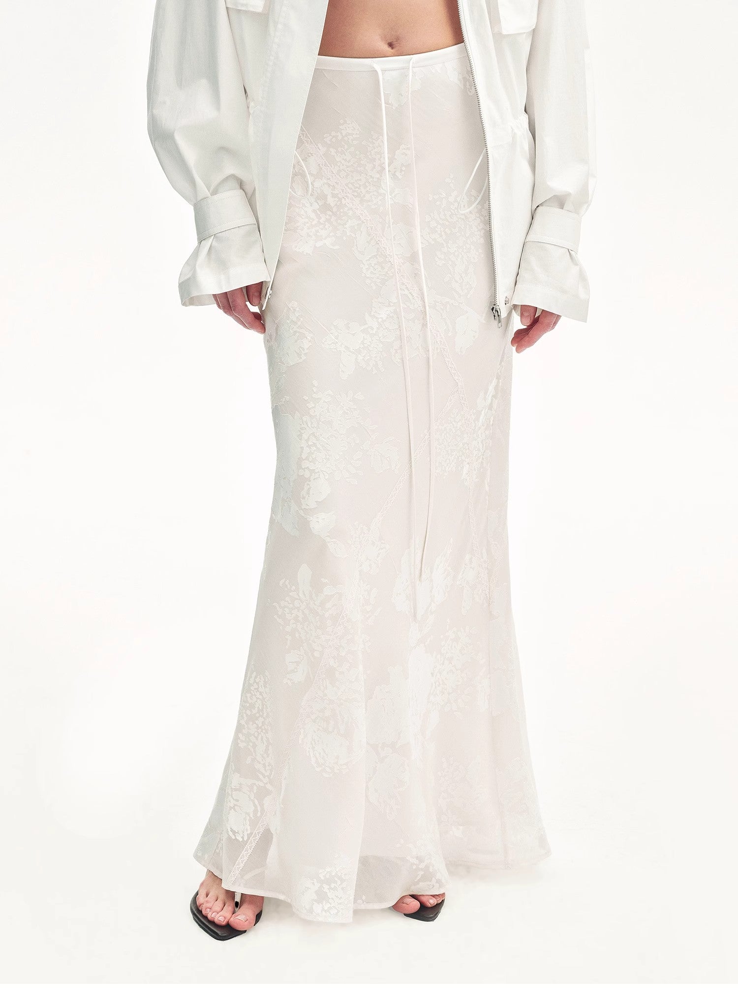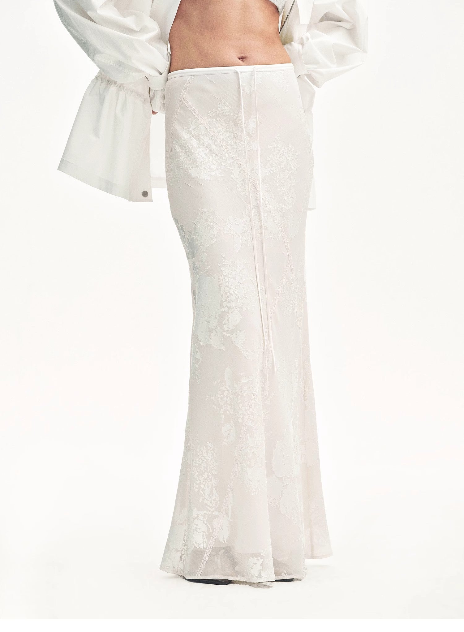 Exquisitely crafted burnout patterns are combined with lace trims. The fabric has a beautiful pearl-like luster, draping gracefully and moving nimbly. With the three-dimensional bias-cut technique, it perfectly highlights the agility of the skirt, achieving a natural harmony with the human body, making you look elegant and slender.