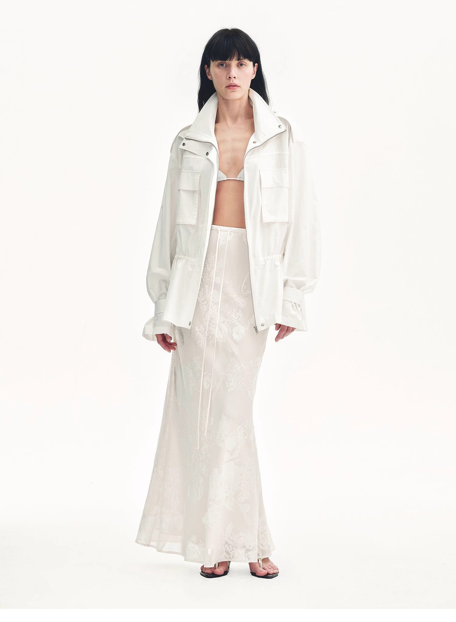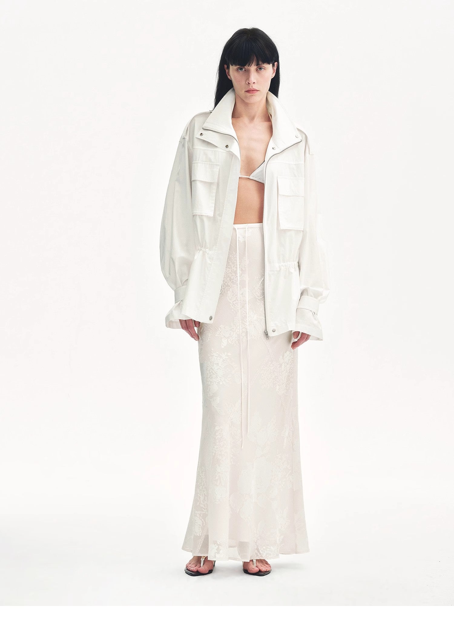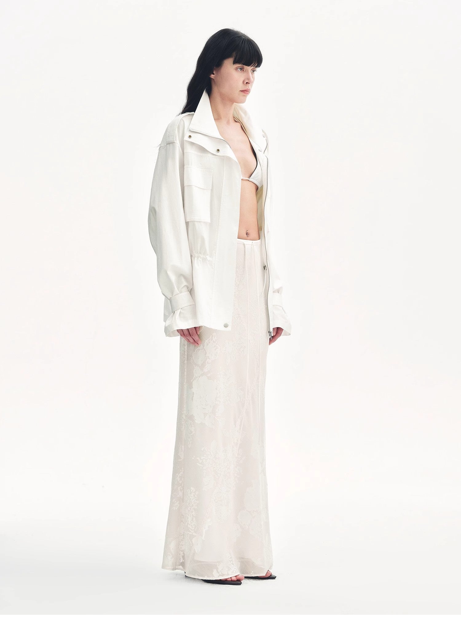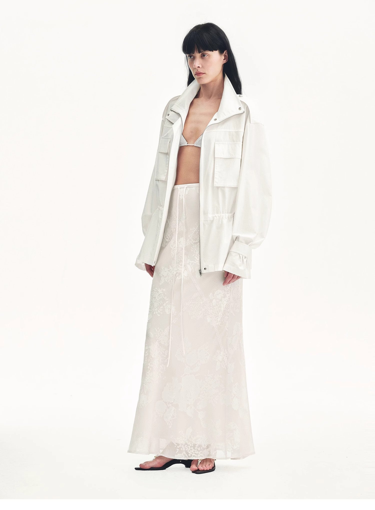 Exquisitely crafted burnout patterns are combined with lace trims. The fabric has a beautiful pearl-like luster, draping gracefully and moving nimbly. With the three-dimensional bias-cut technique, it perfectly highlights the agility of the skirt, achieving a natural harmony with the human body, making you look elegant and slender.