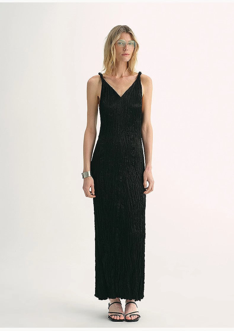 Three-Dimensional Wave Drape Pleated V-Neck Suspender Dress