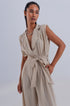 Collar: V-neck neckline. Detail: Accessory not included. Fit: Relaxed fit. Leg: Wide leg. Length: Maxi length. Pockets: Side pockets . Product details: Shoulder pads. Sleeves: Sleeveless style. Style: Tailored. Subcategory: Jumpsuit. Waist: Tie waist. Zipper: Tie fastening . runs true to size. S.