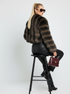 Multitonal Faux Fur: The protagonist element is the luxurious faux fur with a thick striped or mottled pattern in shades of dark brown, light brown, and black. This color variation adds visual depth and a wild and glamorous touch.