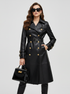 The design of this trench coat focuses on sartorial discipline, the leather texture, and the metallic shine of the contrast hardware: